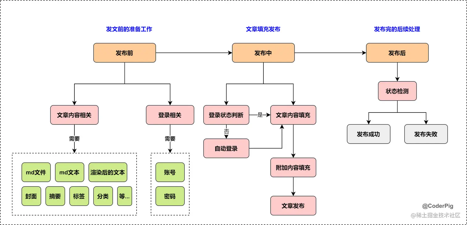可以发文的过程划分为三步:发布前 → 发布中 → 发布后,接着对每个阶段具体的流程进行细化: