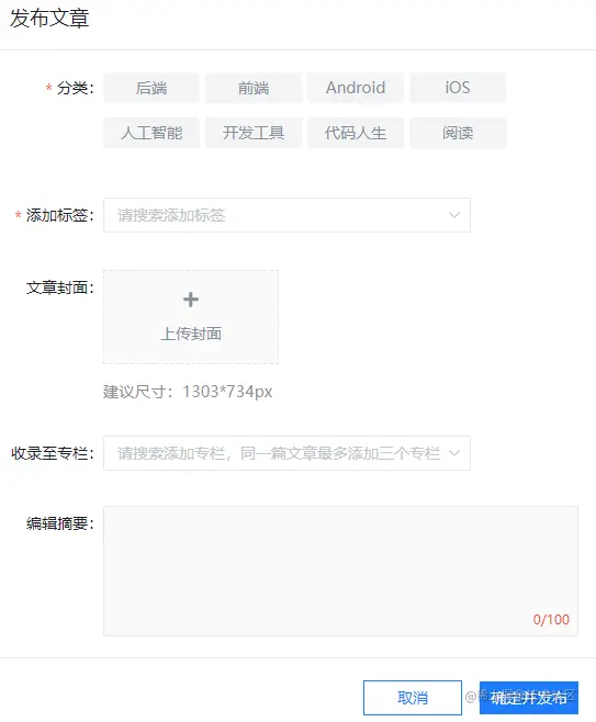 点击右上角发布按钮 → 选择分类 → 添加标签 → 上传文章封面 → 选择专栏(可选) → 输入摘要 → 点击确定并发布