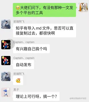 最近突然想起这件事了,好文怎能埋没,其他平台也得发一发,照惯例,先问下有没有轮子先,有的话就不用自己造了,于是群里问了一波: