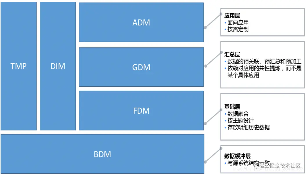 数据仓库标准上可以分为四层。但是注意这种划分和命名不是唯一的,一般数仓都是四层,但是不同公司可能叫法不同。比如这里的临时层叫复制层SSA,京东则叫BDM。同样阿里巴巴却是五层数仓结构,更加详细,但是核心的理念都是从四层数据模型而来。如下分别展示京东和阿里巴巴数仓的架构层次和命名。