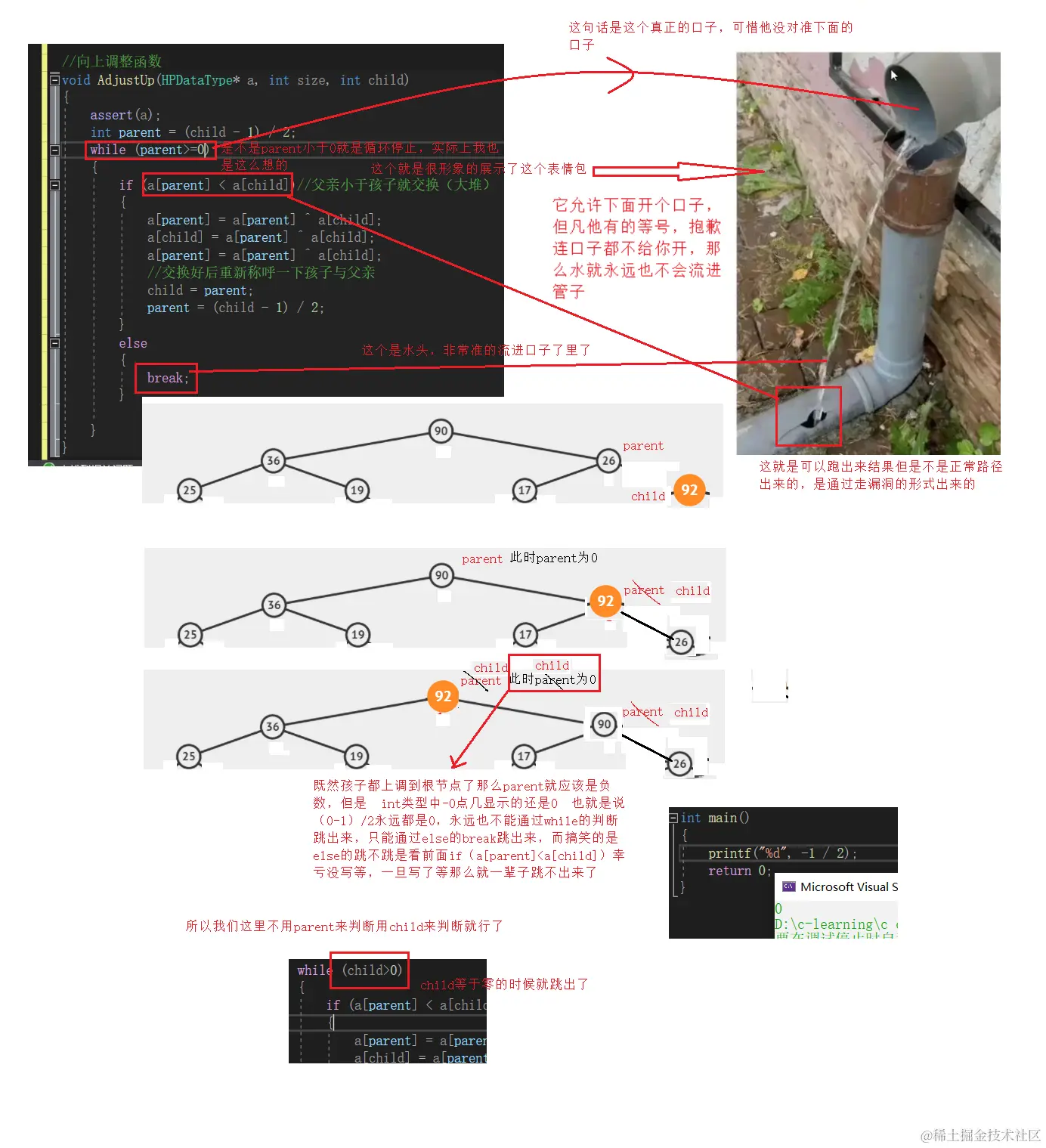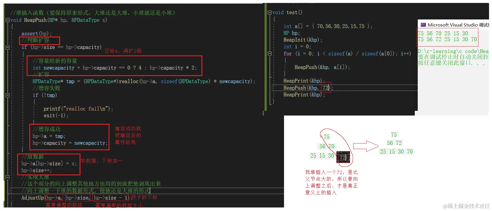 为了不影响数据的存储形式(大堆还得是大堆),插入数据就不能破坏大堆的形式,我们需要把堆插入函数中的数据调整给剥离出来
