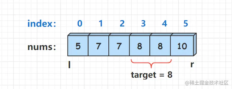 nums[r] != target,说明数组中不存在目标值target,返回[-1, -1]。否则我们就找到了第一个>=target的位置L。
