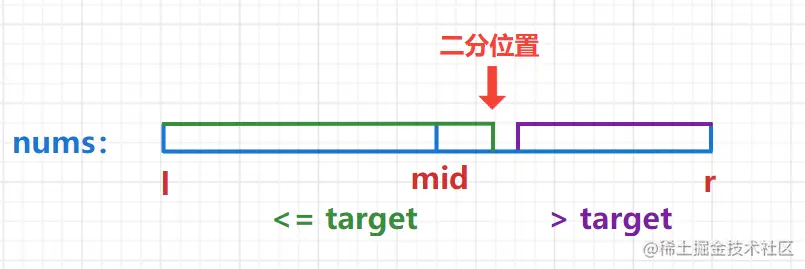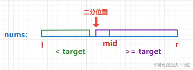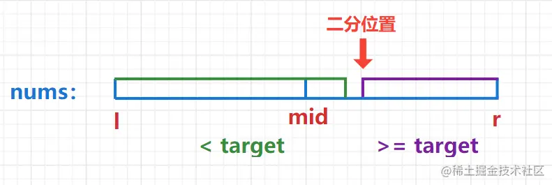 nums[mid] >= target时,往左半区域找,r = mid。 -