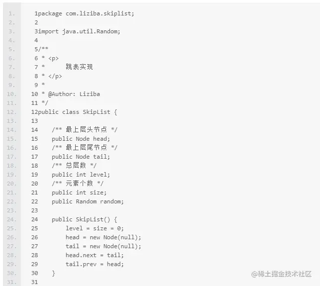 head -> SkipList中的头节点的最上层头节点(level最大的层的头节点),这个节点不存储元素,是为了构建列表和查询时做查询起始位置的,具体的结构请看2.3中的结构