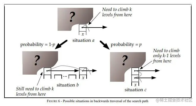 节点x存在(i+1)层指针,那么向上爬一级,概率为p,对应下图situation c.