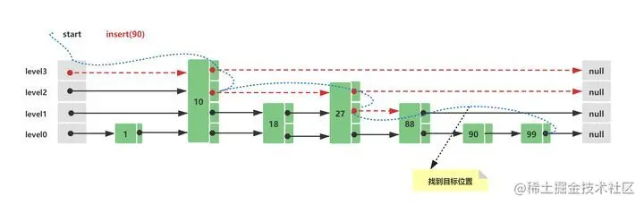 查询插入位置,与Skip List查询方式一致,这里需要查询的是第一个比90大的节点位置,插入在这个节点的前面, 88 < 90 < 100
