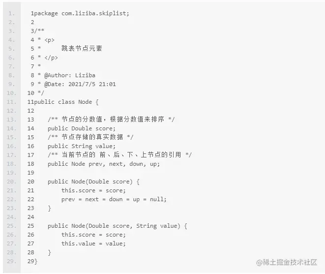 定义Skip List的节点Node,节点之间以链表的形式存储,因此节点持有相邻节点的指针,其中prev与next是同一level的前后节点的指针,down与up是同一节点的多个level的上下节点的指针