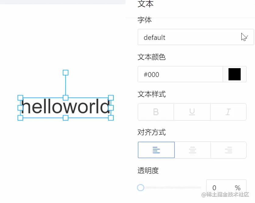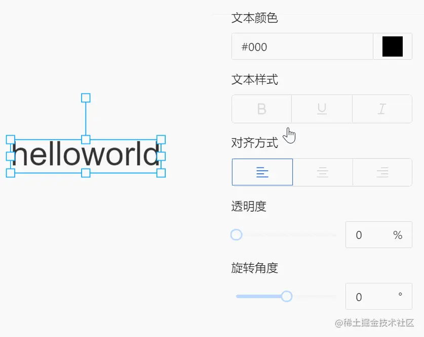 在 konva 中字体的对齐方式的属性是align,值为:left、center、right。控件的实现方式与上一段类似,只是多选与单选的区别。