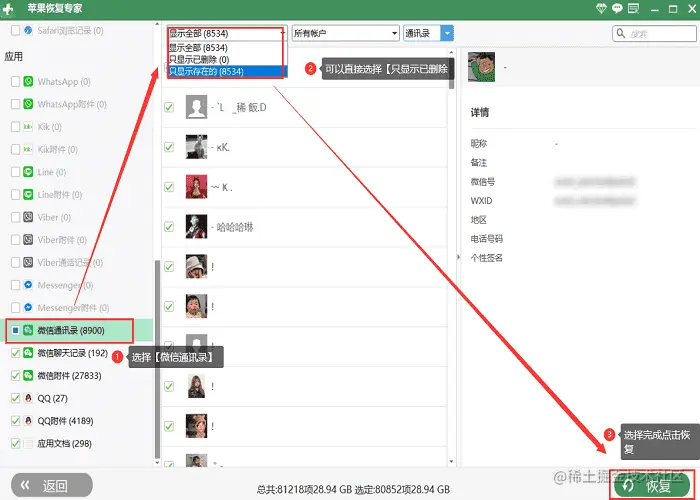 第三步、等待第二步结束后就可以恢复最近删除的好友了。在最左侧下拉找到【微信通讯录】,点击进去查找最近删除的好友,找到后直接勾选,点击下方的恢复。