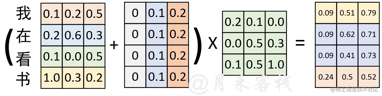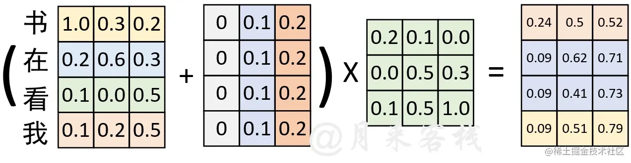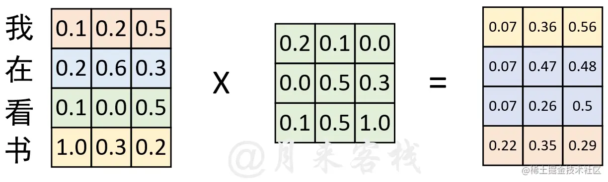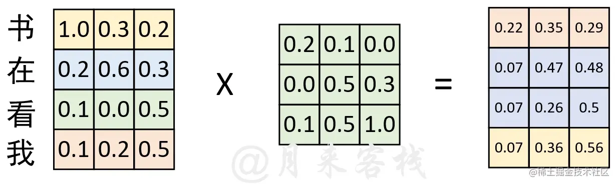 在通过图1-5示的过程计算得到权重矩阵后,便可以将其作用于V ,进而得到最终的编码输出,计算过程如图1-6所示。