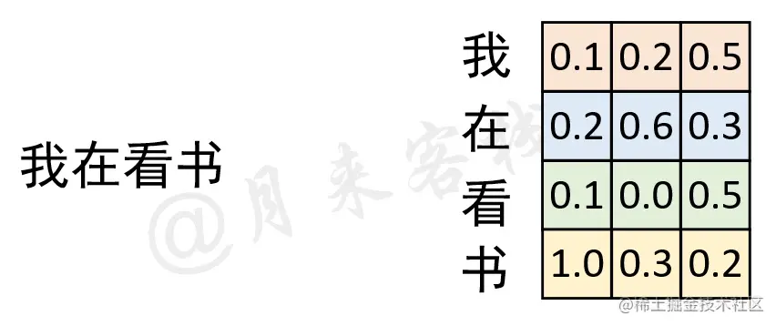 如果仅仅只是看着图1-3中的结构以及公式中的计算过程显然是不那么容易理解自注意力机制的含义,例如初学者最困惑的一个问题就是图1-3中的Q、K和V分别是怎么来的?下面,我们来看一个实际的计算示例。现在,假设输入序列“我 是 谁”,且已经通过某种方式得到了1个形状为