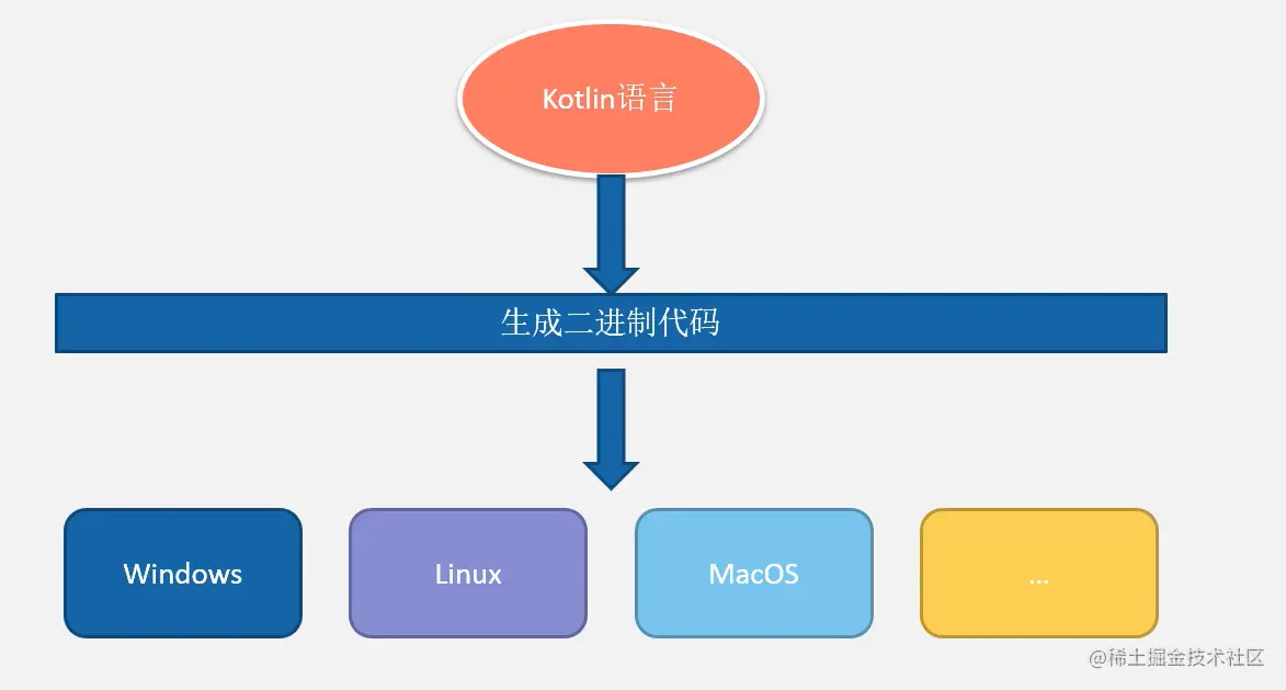 - Kotlin能脱离虚拟机层,直接编译成可以在Windows、Linux和macOS平台上运行的原生二进制代码。