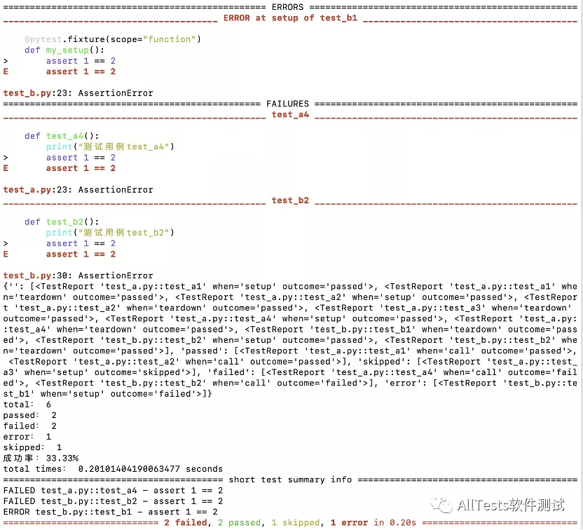 用例总数是6,但是测试报告状态结果为2 failed, 3 passed, 1 skipped, 1 error,合计为7。