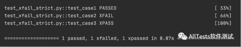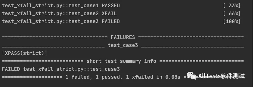 标记为@pytest.mark.xfail()的test_case2和test_case3测试用例,两个都标记失败,我们希望两个用例全部显示xfail,但实际上test_case3显示XPASS(因为test_case3的断言是正确的)。