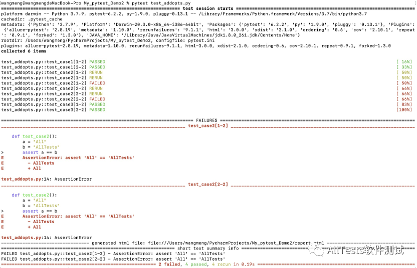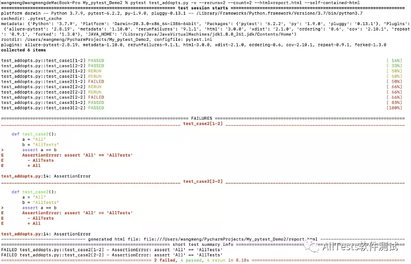 输入执行命令(失败重跑两次,一共运行两次,测试完成后生成测试报告)