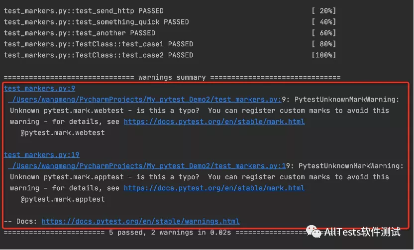 注:测试用例中添加了 @pytest.mark.webtest、@pytest.mark.apptest 装饰器,如果不添加 markers 选项的话,执行后就会报 warnings。