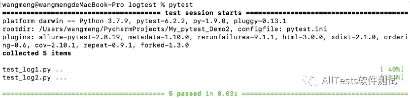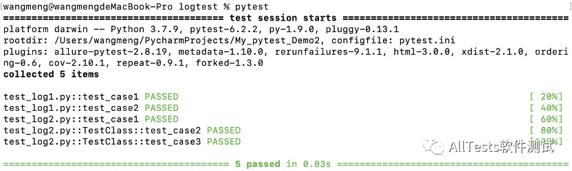 命令行输入pytest运行logtest包下的所有用例,运行结果: