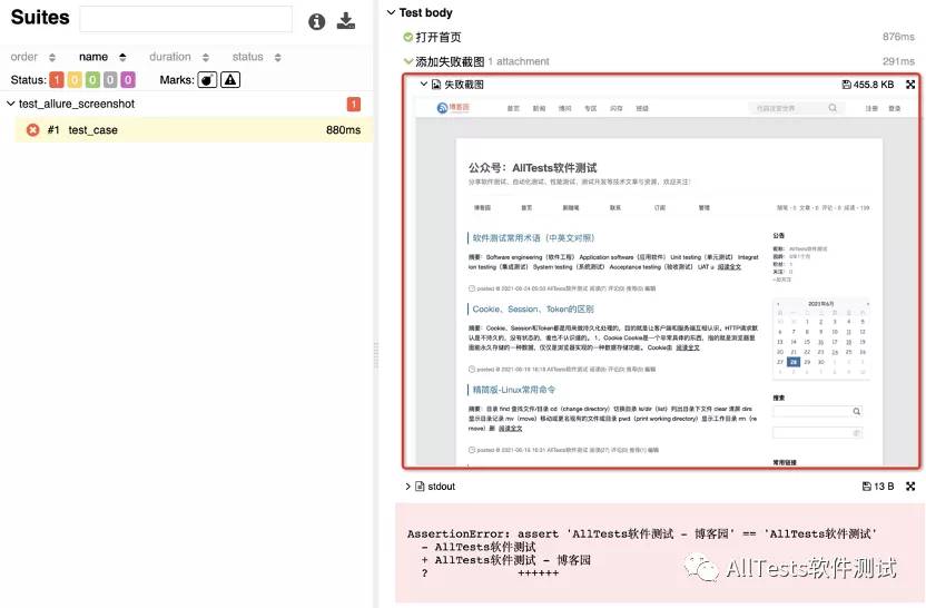 在进行 UI 自动化的时候,执行测试用例失败时,想把用例失败的截图展现在 allure 报告里面。