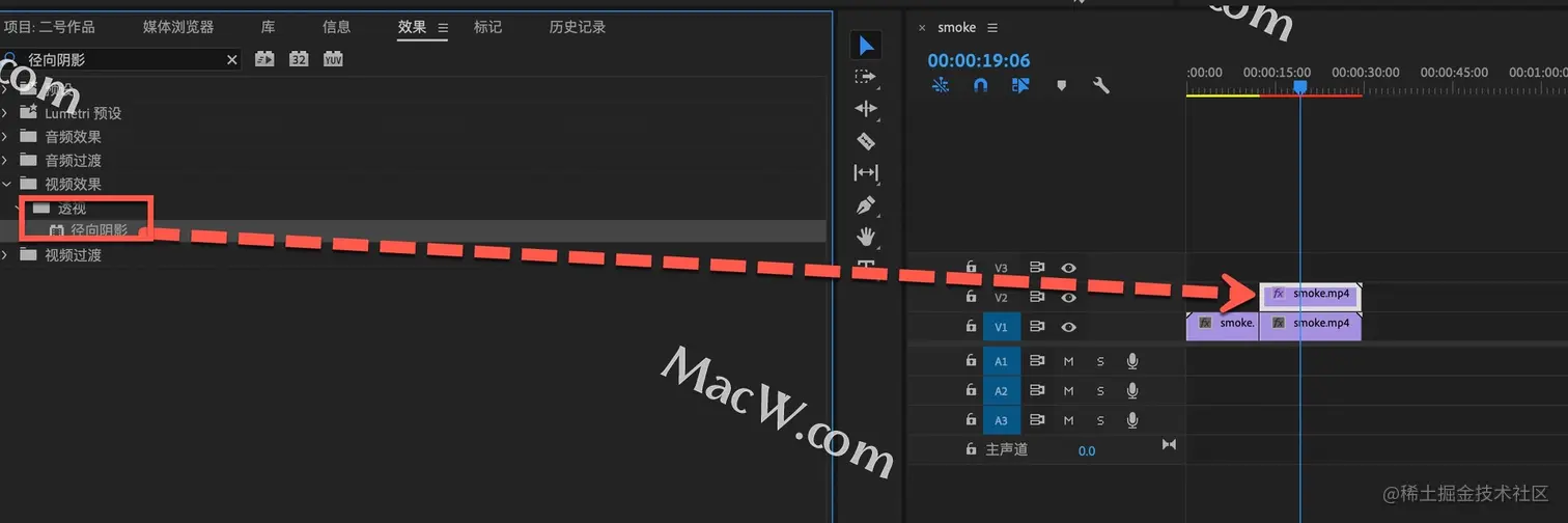 再次在效果中搜索径向阴影,然后添加到V2素材中