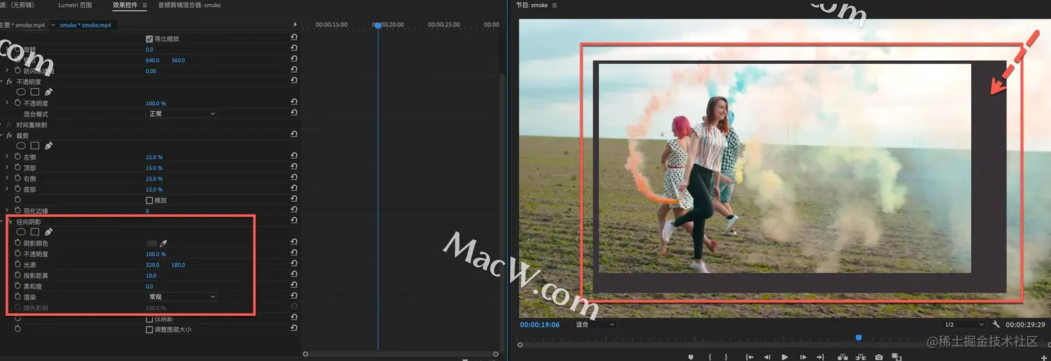 预览画面出现相框效果,在左侧的效果控件-径向阴影中,可以进行相框调整,例如颜色、不透明度等