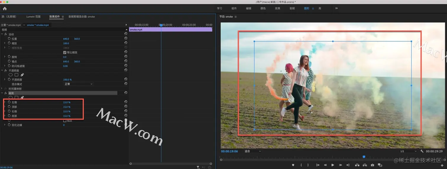 在效果控件-裁剪中,将左侧、顶部、右侧、底部的数值都修改为15,现在在预览画面中可以看到出现一个蓝色方框