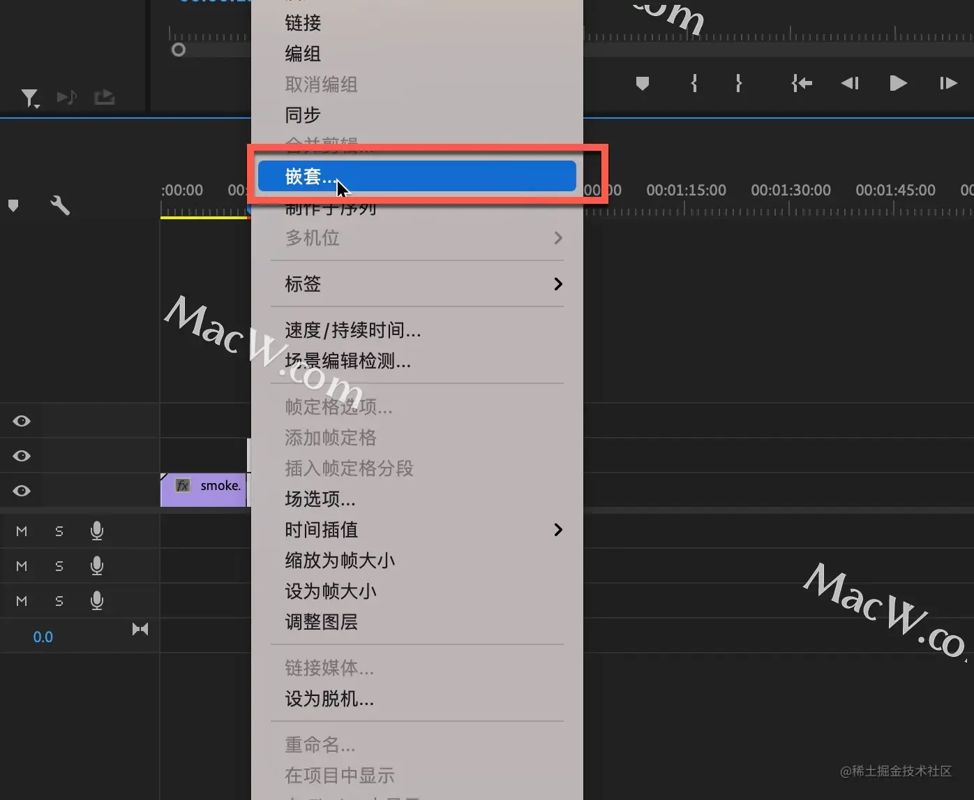 选中V1、V2轨道中后面的小段素材,右键点击-嵌套