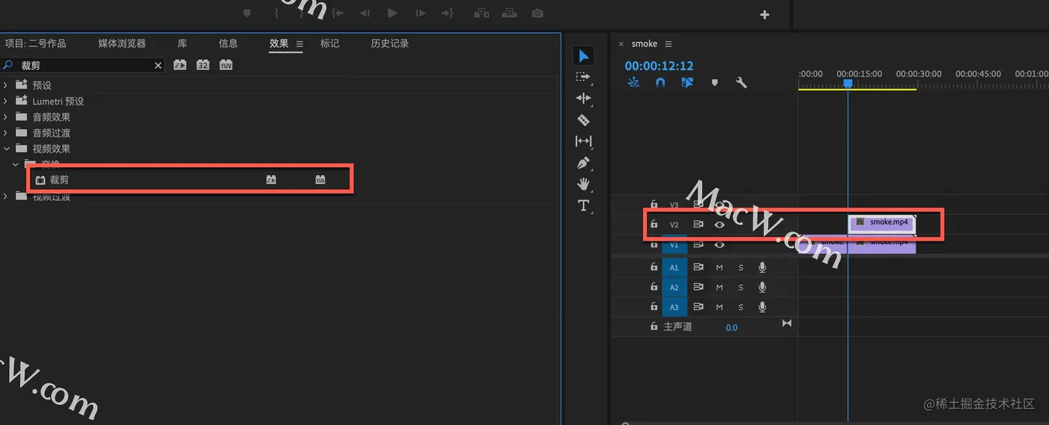 选中V2轨道上的素材,在效果中搜索裁剪,然后将裁剪效果拖拽到V2素材上