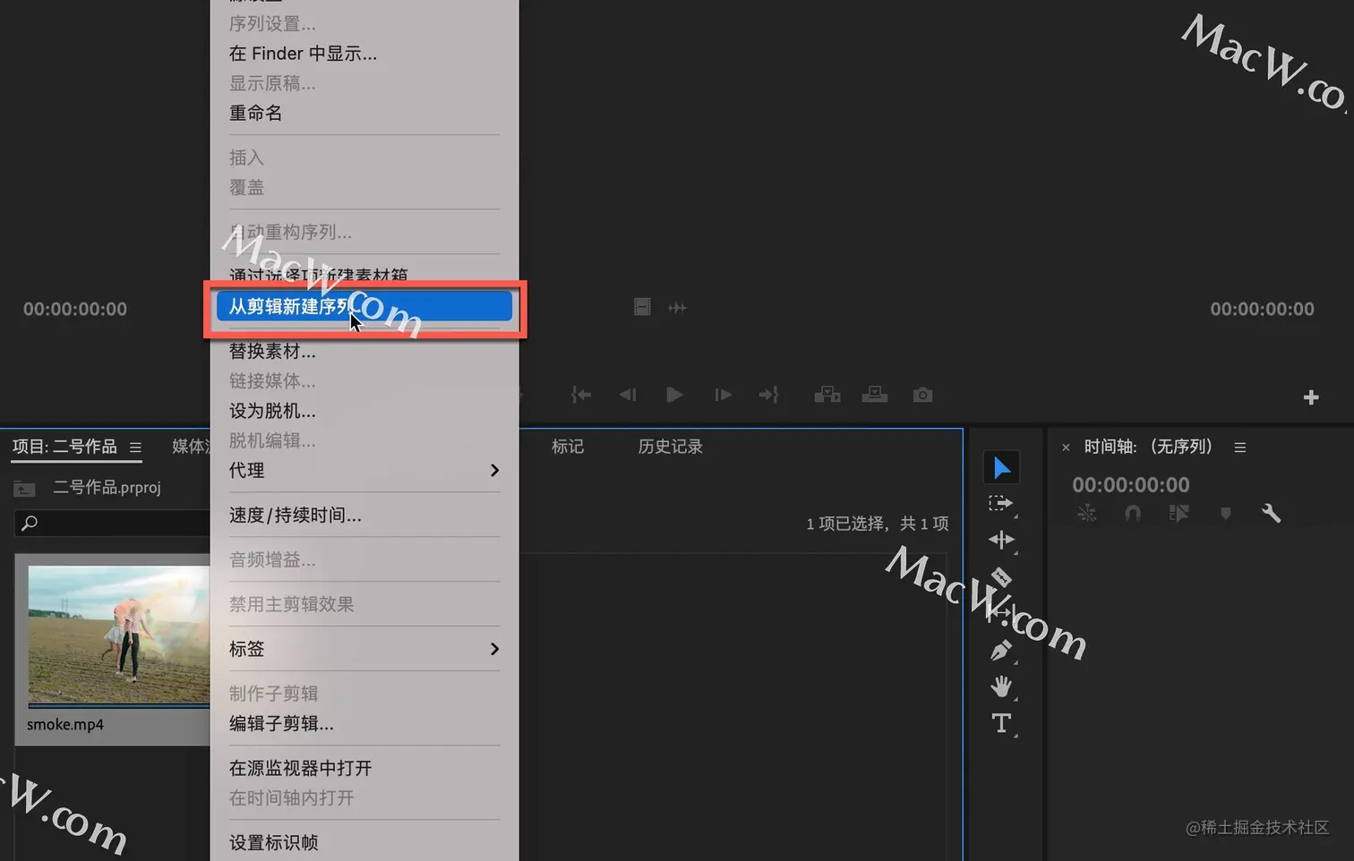 首先在premiere中打开需要编辑的视频素材,在素材上右键单击-从剪辑新建序列