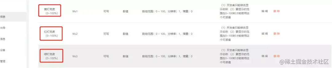 本例中我们使用了"Ws1”,"Ws2”,"Ws3”,这三个整数型数据点(范围0~100)来作为机智云下发黄、红、绿灯亮度百分比的数据通道,记得在机智云平台修改相应的数据点的名称。