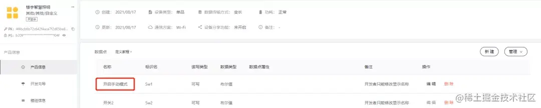 本例中我们使用了"Sw1”状态位型数据点作为机智云下发自动/手动切换模式的数据通道,记得在机智云平台修改相应的数据点的名称。