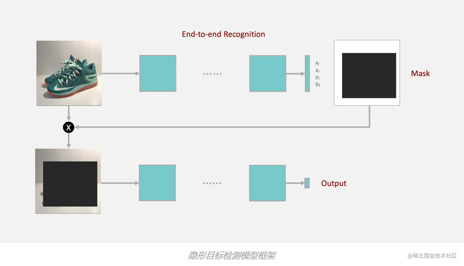 我们可以像目标检测的步骤那样,在中间的模型的过程中,预测一个区域,就是一个 bounding box。输出也就是 4 个维度。通常是可以输出 左上角、右下角;左上角、宽高;或者中心坐标、宽高。然后利用原图像和这 4 个维度的结果做一个 mask 过滤,过滤掉主体,再进行下一步的识别作用。