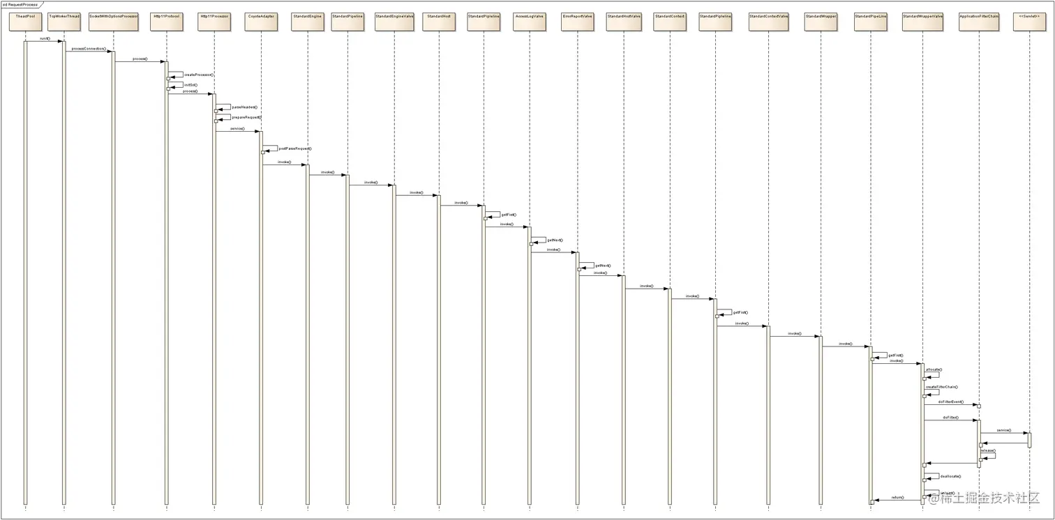 如上时序图可知,最终是交由Http11Processor去解析请求信息,并创建Request和Response对象。之后将Request和Response对象交由Engine引擎容器处理,Engine容器最后将请求交由过滤器链过滤处理,最后让对应Sevelet类处理并响应。