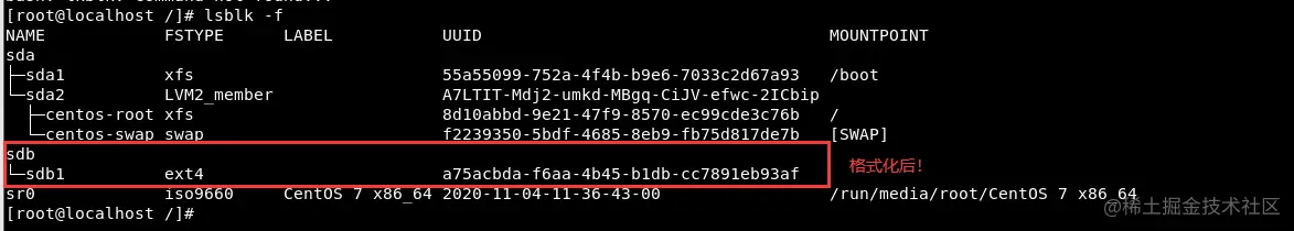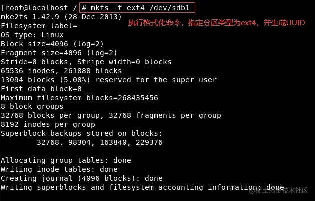 ③ 格式化 : mkfs -t ext4 /dev/sdb1 或 mkfs.ext4 /dev/sdb1