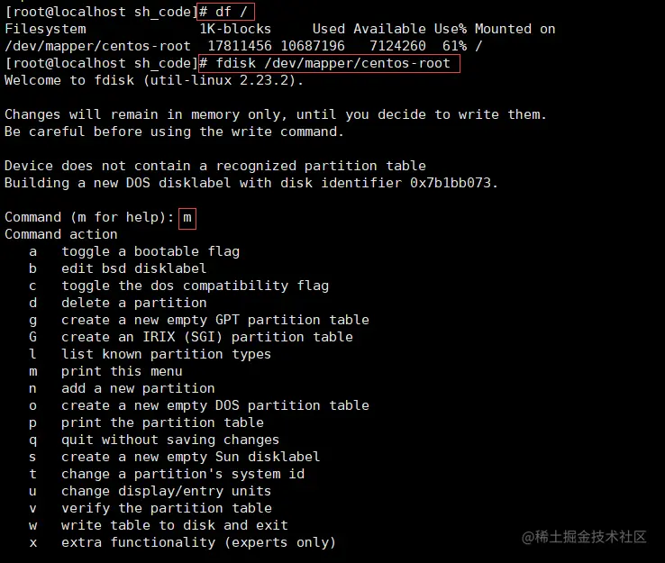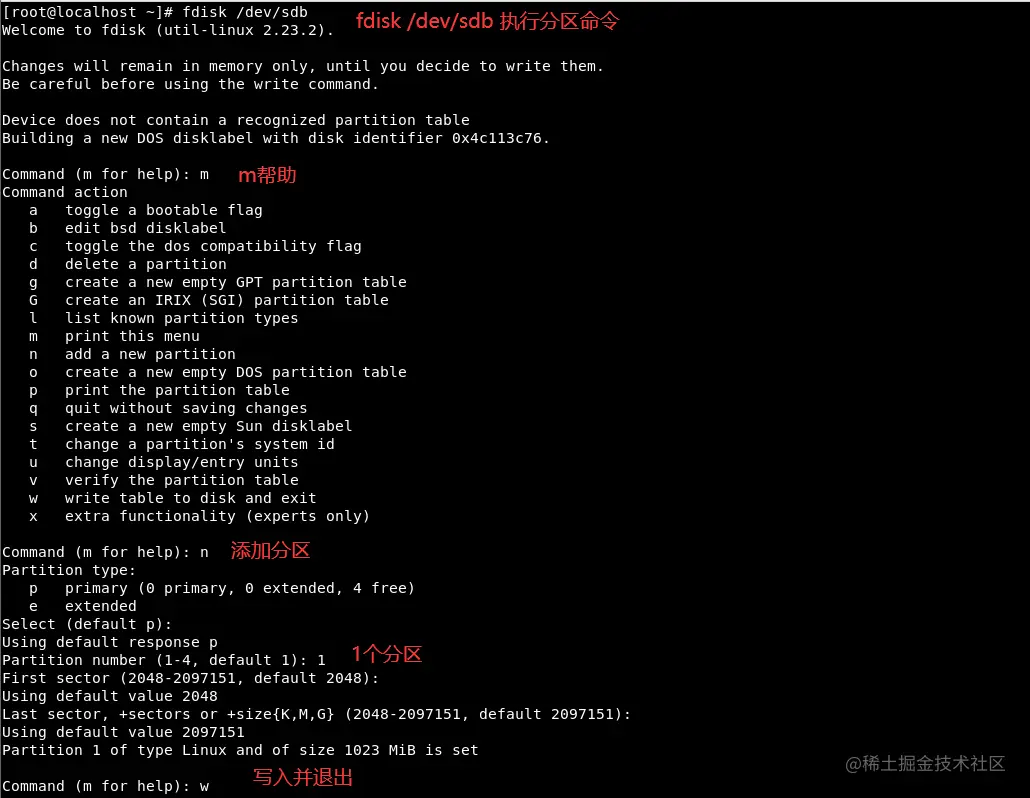 m:显示命令列表p:显示磁盘分区,像fdisk -l一样n:新增分区d:删除分区w:写入并退出