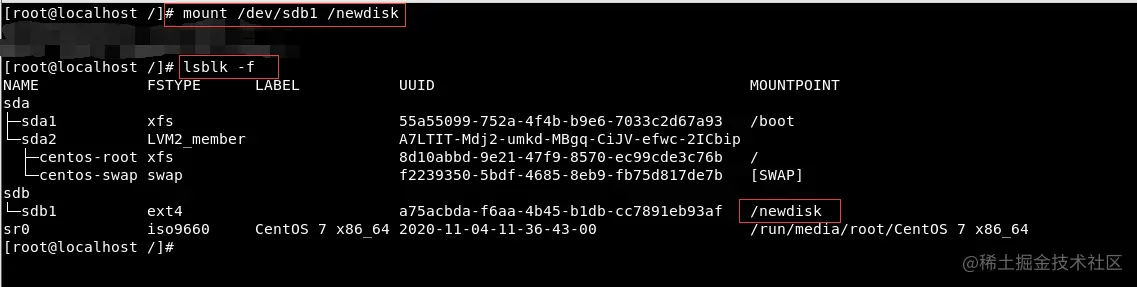 mount /dev/sdb1 /newdiskumount <设备名称或挂载目录>:umount /dev/sdb1、umount /newdisk- 注意:使用命令行的 mount 挂载分区,重启后会失效!