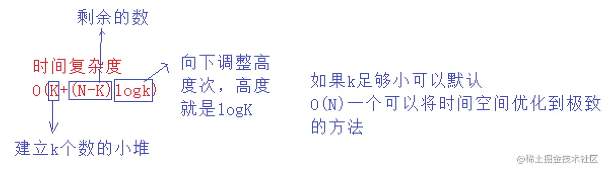 假设N非常大,N是10亿,内存中存不下这些数,他们存在文件中,k是100。那么方式1与方式2就都不可以用了。时间复杂度 O(K+(N-K)log