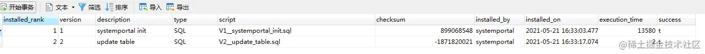 table: flyway_schema_history_systemportal #flyway记录表,记录了当前执行到了那个脚本