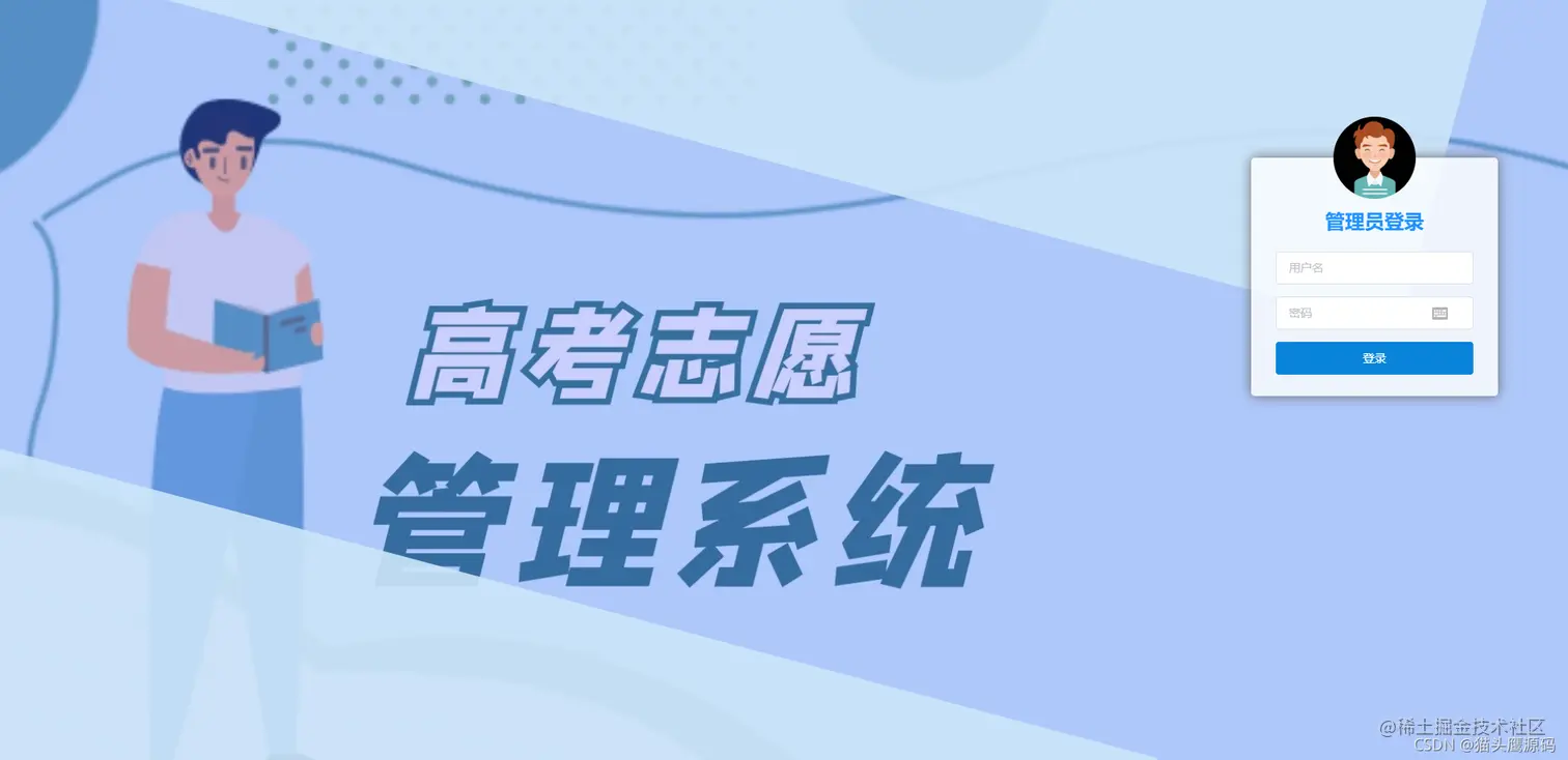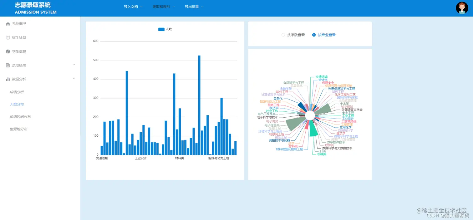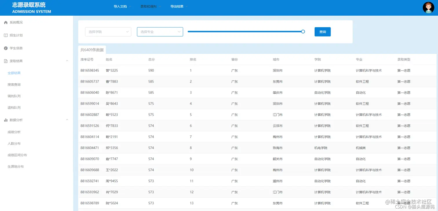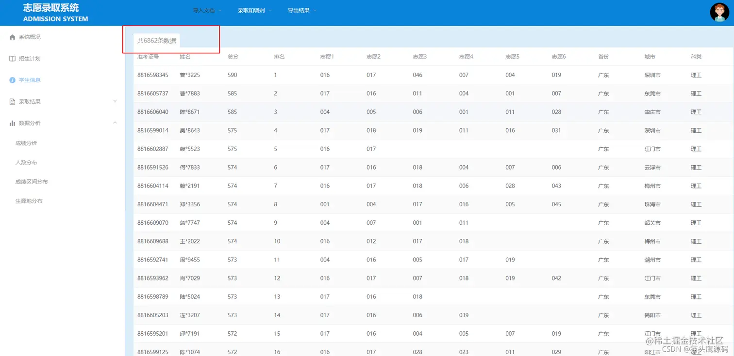 本系统为前后端分离,适合选题:前后端分离、志愿录取、高考志愿、志愿分析等,系统采用springboot+vue整合开发,前端主要使用了elementUI框架、项目后端主要使用了springboot等一系列框架,数据层采用mybatis。