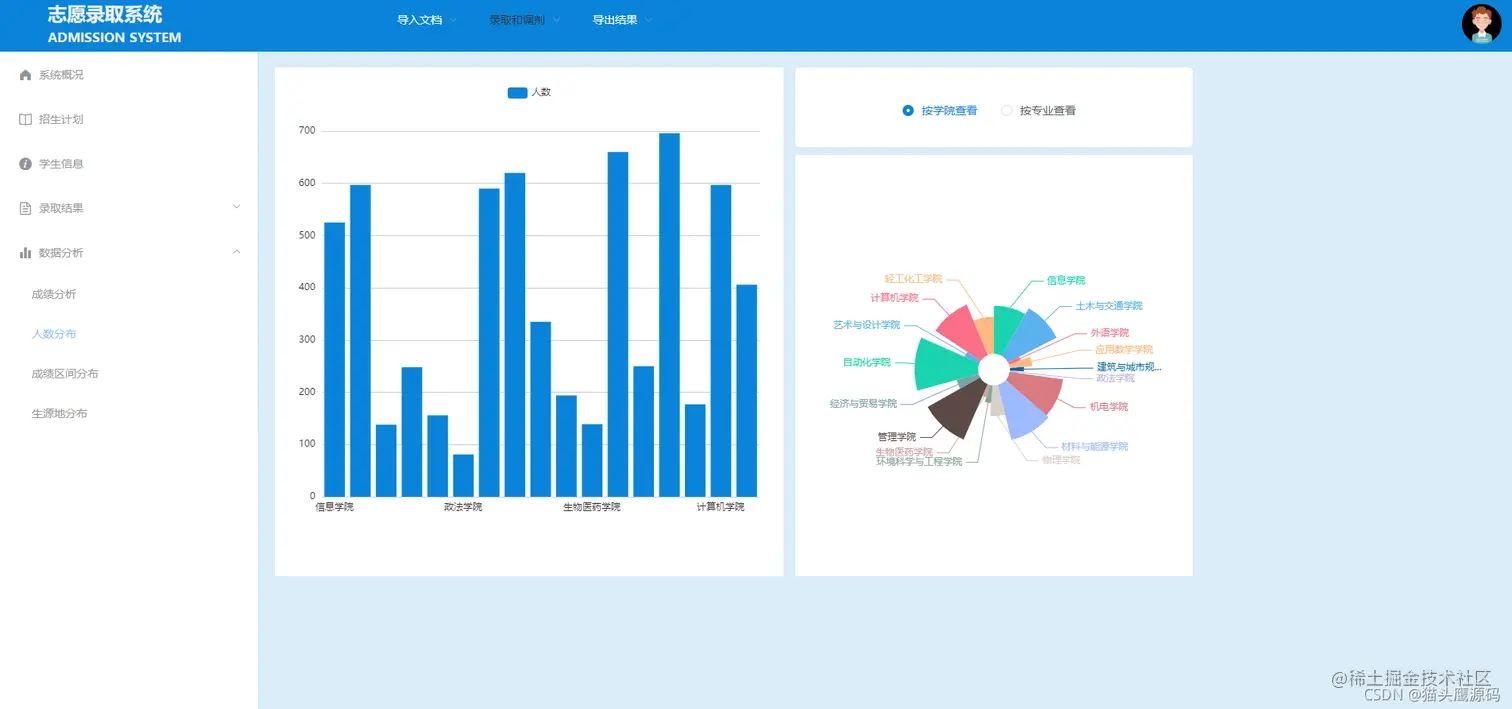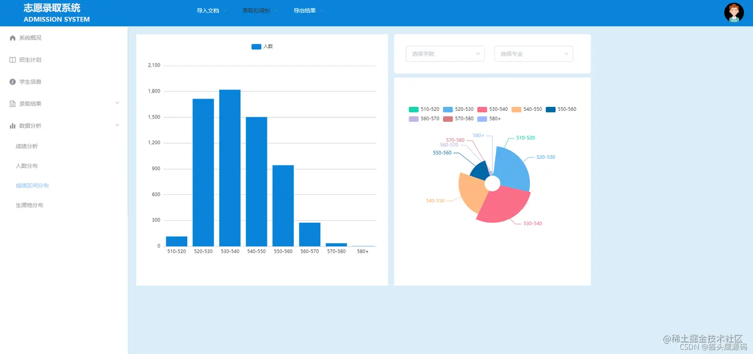 成绩区间分布:可以按照学院或者专业动态查看成绩的分布情况
