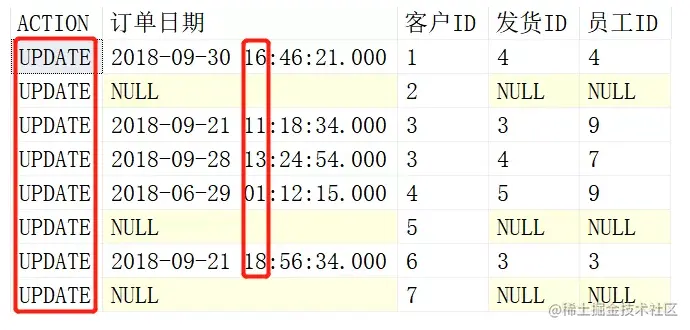 从上图我们看到,执行的动作都是更新,这里的动作只有UPDATE和DELETE,插入也属于更新,此外我们看到订单日期又往后推迟了一小时,是因为我们又一次执行了往后增加一小时的更新操作,其他的字段没变。