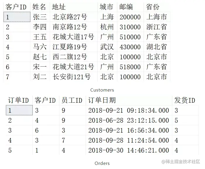 下面我们通过一个示例来介绍一下该如何使用MERGE,我们以Customers表和Orders表为例。数据如下: