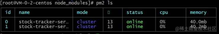 多执行几次 pm2 ls ,直到几个应用 status 趋于稳定,如果最终显示 online,如图