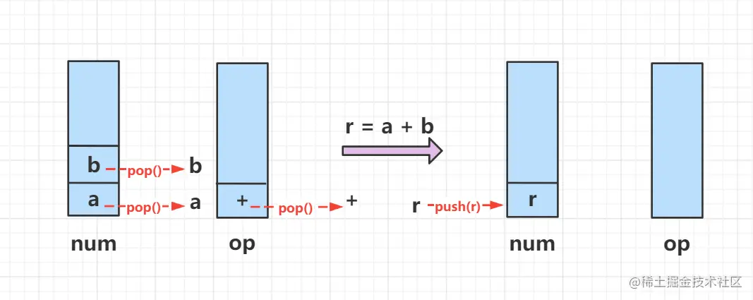 首先我们定义一个eval()函数,用于从数字栈num中弹出两个数字a和b,再从操作符栈op中弹出操作符号,进行计算后将结果数字加入到数字栈num中。