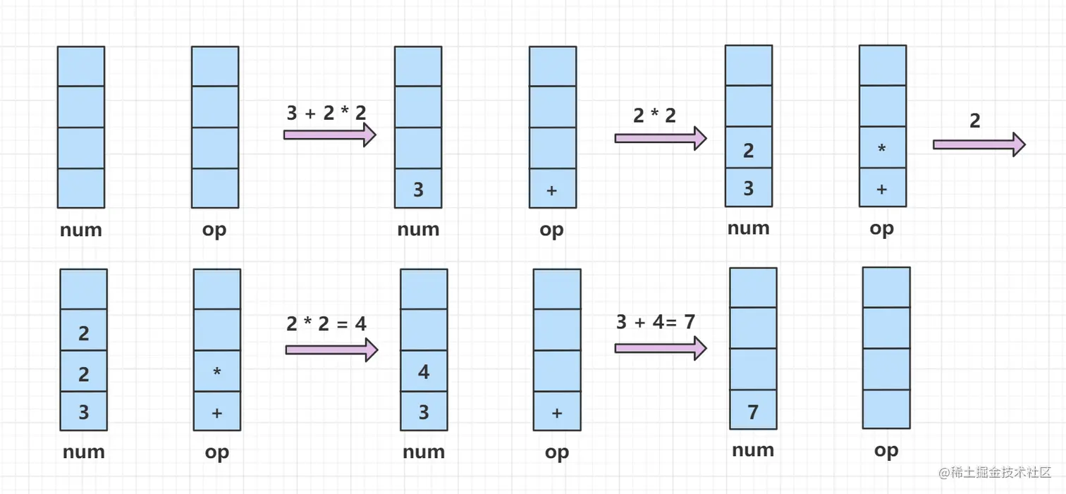 对于表达式求值这类问题,我们维护两个栈,一个num栈用来记录数字,一个op栈用来记录操作符,遍历表达式,遇到操作符时进行数的相应计算。