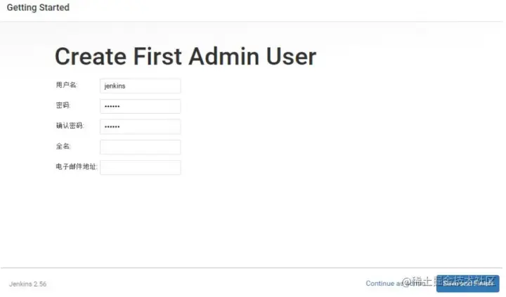 如果创建 user,则作为登录的帐号,不创建直接点击 continue as admin 链接,跳转到 jenkins 登录页面,用户名为 admin,密码是 initialAdminPassword 文件里密码。修改 admin 密码可在系统管理-管理用户中修改。