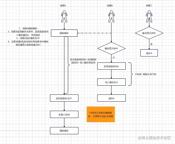 同理线程1和线程2并不是串行的,如果此时线程1还没来得及时更新数据库,那么线程2 读取的还是老数据,因为没命中所以还会把老数据写入缓存。那么数据库和缓存数据就不一致了。这个不一致的时间窗口取决于缓存过期时间或下一次删除缓存的时间。
