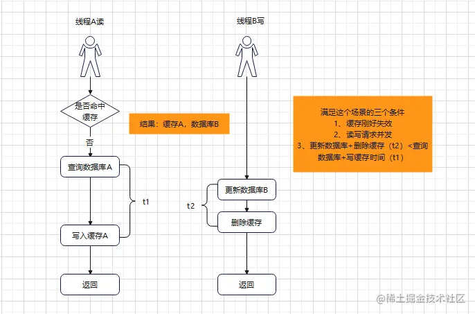 线程2:第一步①查询缓存key的值,没命中。第二步②从数据库中读取,③第三步写入缓存A