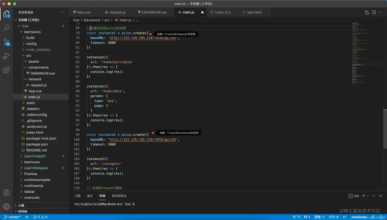 为什么要创建axios实例,因为如果一个项目要发送不同地址的网络请求,如果向之前那样定义全局的aixos实例肯定是不不信的,要向下面这样去写