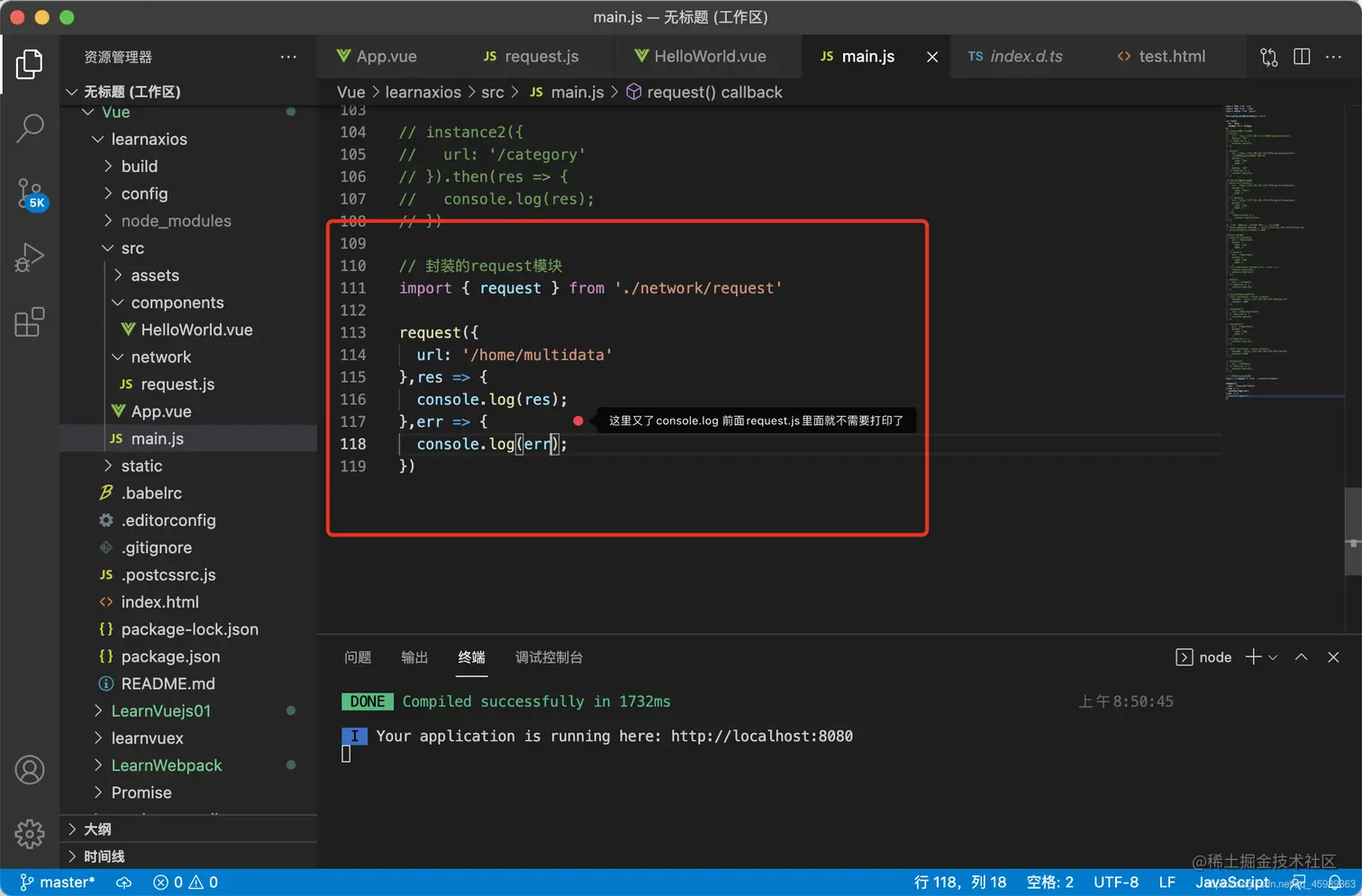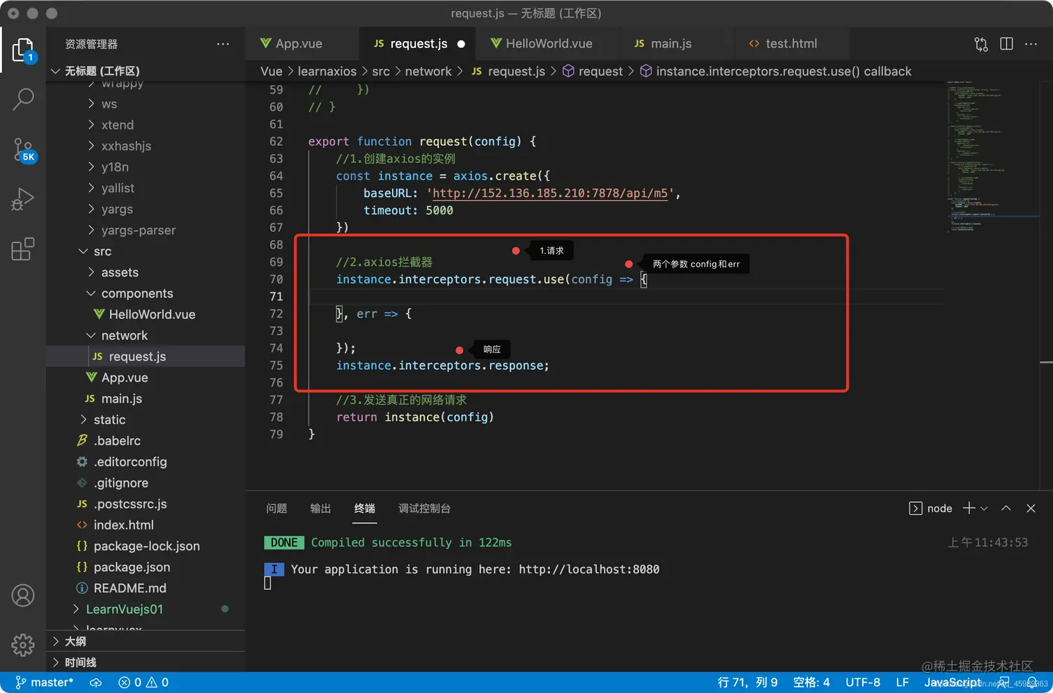 不难发现,在request.js 71行打印了一个object 但是在main.js里面返回了一个错误的信息, 因为把config拦截了嘛 当然返回err哦。哈哈 是不是很简单的逻辑