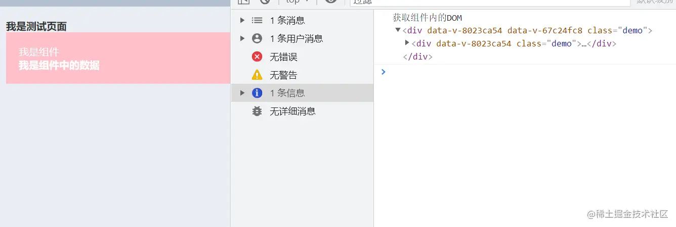 console.log('获取组件内的DOM',this.$refs.testRef);